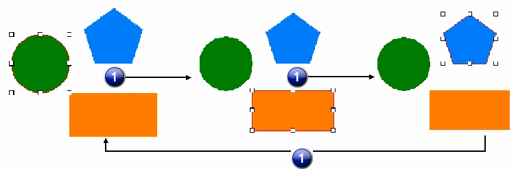 Mit der TAB-Taste kann das jeweils nächste Objekt ausgewählt werden. Die Auswahlreihenfolge entspricht der Reihenfolge, in der die Objekte angelegt wurden.