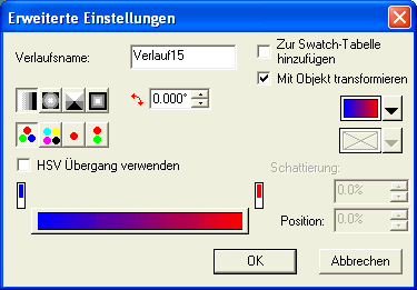 Wenn Sie für eine Verlaufsfüllung auf die Schaltfläche Erweitert (Füll/Stift-Editor - Füllung-Register) klicken, wird das Dialogfeld für die erweiterten Einstellungen angezeigt.